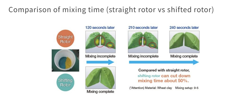 การเปรียบเทียบประสิทธิภาพการผสมระหว่างการวางภาชนะแบบตรงกลาง (straight rotor) กับการวางภาชนะแบบเลื่อนออก (shifting rotor) โดยใช้วัสดุ ดินน้ำมัน (wheat clay) โดยตั้งค่าการผสมที่ 9-5