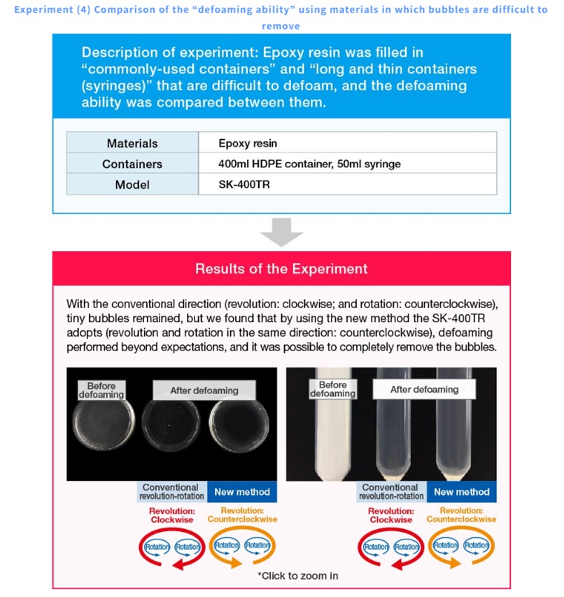ผลทดลองพบว่า การหมุนด้วยทิศทางแบบดั้งเดิมนั้นฟองอากาศขนาดเล็กยังคงเหลืออยู่ แต่พบว่าการใช้วิธีใหม่ที่ SK-400TR ใช้การกำจัดฟองอากาศทำงานได้ดีเกินความคาดหมาย และสามารถกำจัดฟองอากาศไปได้อย่างสมบูรณ์ ซึ่งแสดงว่าการหมุนแบบใหม่ (New method) ของเครื่อง SK-400TR ที่กำหนดทิศทาง revolution และ rotation หมุนทวนเข็มนาฬิกา มีประสิทธิภาพในการกำจัดฟองอากาศจากอีพอกซีเรซินได้ดีกว่าวิธีเดิมอย่างชัดเจน ทั้งภาชนะ 400ml HDPE, 50 ml syringe โดยสามารถกำจัดฟองอากาศออกไปได้อย่างสมบูรณ์